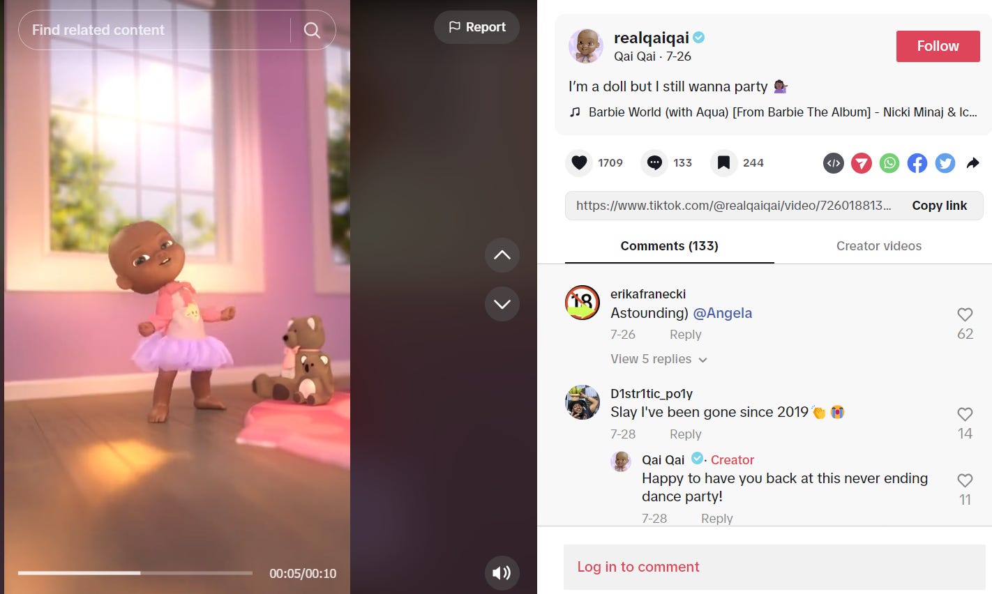 Qai Qai: Qai Qai is the virtual generation of Serena Willians and Alexis Ohanian's daughterâs doll created by Invisible Universe. Being a baby doll, Qai Qai is funny and sassy, making everyone interested in following her. On TikTok, Qai Qai is more famous, gathering 4.5 million followers. She dances, answers questions, lip-syncs to sounds, and just simply entertains.
